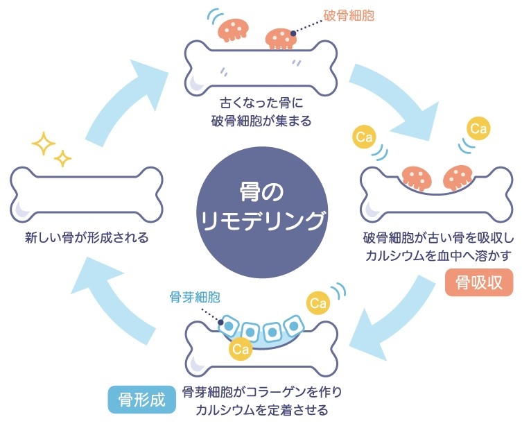 私たちの体の中では古くなった骨を壊して新しく作り直す骨のリモデリングが行われており、若い人であれば3~4年で体全体の骨が入れ替わっているといわれています。これは古くなった骨を壊す破骨細胞と、新しく骨を作る骨芽(こつが)細胞の働きによるものです。この破骨細胞による骨吸収と骨芽細胞による骨形成のバランスが崩れ、骨吸収が骨形成を上回ってしまい骨がスカスカになるのが骨粗鬆症の状態です。