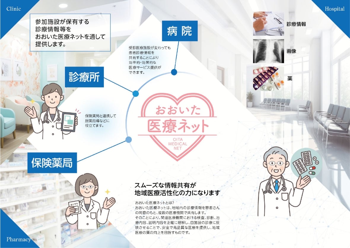 大分県立病院では、おおいた医療ネット「おおいたLink」の運用を開始いたしました。医療情報を電子的に共有することにより、患者さんに迅速かつ安全で効率的な医療を提供することが可能になりました。オンラインで薬や検査の内容を正確に把握できるため、重複による患者さんの自己負担が軽減できます。また、双方の医療機関を受診しても一貫して継続した医療が受けられるため、患者さんの安心感におおきく繋がります。