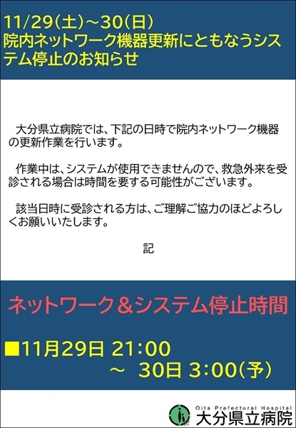 NEWS & TOPICS TOP NEWS & TOPICS 来院される方へ 11/29(土)~ 院内ネットワーク機器更新にともなうシステム停止のお知らせ 11/29(土)~ 院内ネットワーク機器更新にともなうシステム停止のお知らせ 来院される方へ 2025年11月26日 大分県立病院では、下記の日時で院内ネットワーク機器の更新作業を行います。 作業中は、システムが使用できませんので、救急外来を受診される場合は時間を要する可能性がございます。 該当日時に受診される方は、ご理解ご協力のほどよろしくお願いいたします。 TOP NEWS & TOPICS一覧 来院される方へ一覧 この記事はお役に立ちましたか? はい いいえ お問い合わせはこちら 気になるキーワードを入力してください。 検索 BlogPost 3544 年別 2025年 2024年 2023年 2022年 2018年 2017年 2016年 2015年 2014年 2012年 カテゴリー 全て 来院される方へ医療関係の方へ就職希望の方へイベント入札情報当院について
