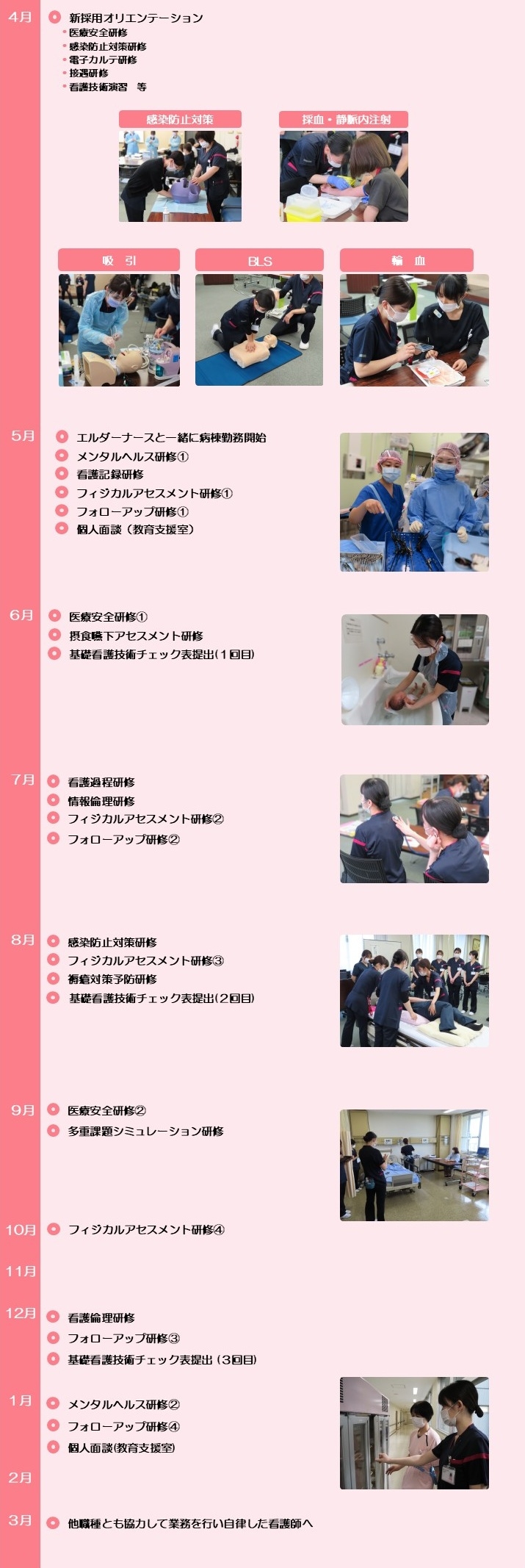 - 新人看護師1人に対してエルダーナース1人の指導体制をとっています。