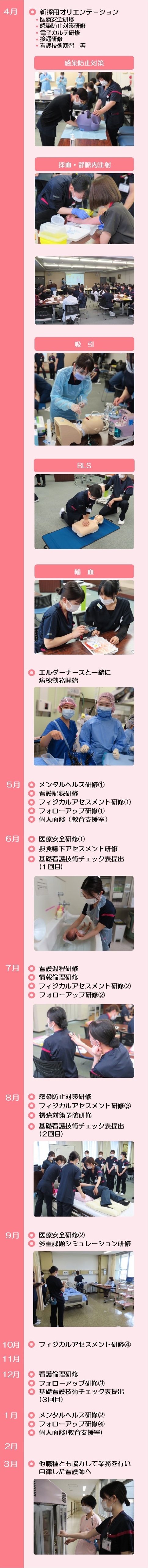 - 院内での集合教育や各部署での教育、公務員としての教育研修、看護協会への研修参加を行いながら循環型教育を行っています。